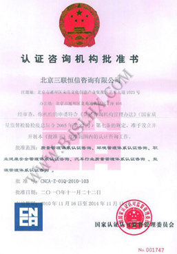 北京三聯(lián)恒信咨詢有限公司是在工商行政管理部門登記注冊,經(jīng)國家認(rèn)監(jiān)委批準(zhǔn)備案的ISO認(rèn)證咨詢機(jī)構(gòu),批準(zhǔn)范圍:質(zhì)量管理體系認(rèn)證咨詢、環(huán)境管理體系 認(rèn)證咨詢、職業(yè)健康安全管理體系認(rèn)證咨詢、汽車行業(yè)質(zhì)量管理體系認(rèn)證咨詢、能源管理體系認(rèn)證咨詢等。批準(zhǔn)號: